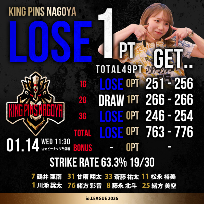io.LEAGUE 2026 Day3 第二試合 結果|キングピンズ名古屋 今季初黒星 投稿日:2026年01月15日 io.LEAGUE 2026 Day3 第二試合にて、キングピンズ名古屋は ピーナッツ千葉と対戦。 接戦の展開となりましたが、1-9で敗戦となり、今シーズン初黒星を喫しました。 前年王者との一戦は悔しい結果となりましたが、この経験を糧に、チームは次戦に向けて立て直しを図ります。 引き続き、キングピンズ名古屋へのご声援をよろしくお願いいたします。 投稿をシェアする :