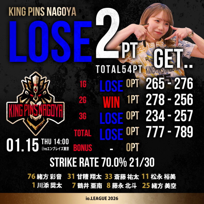 io.LEAGUE 2026 Day4 第三試合 結果|キングピンズ名古屋 惜敗